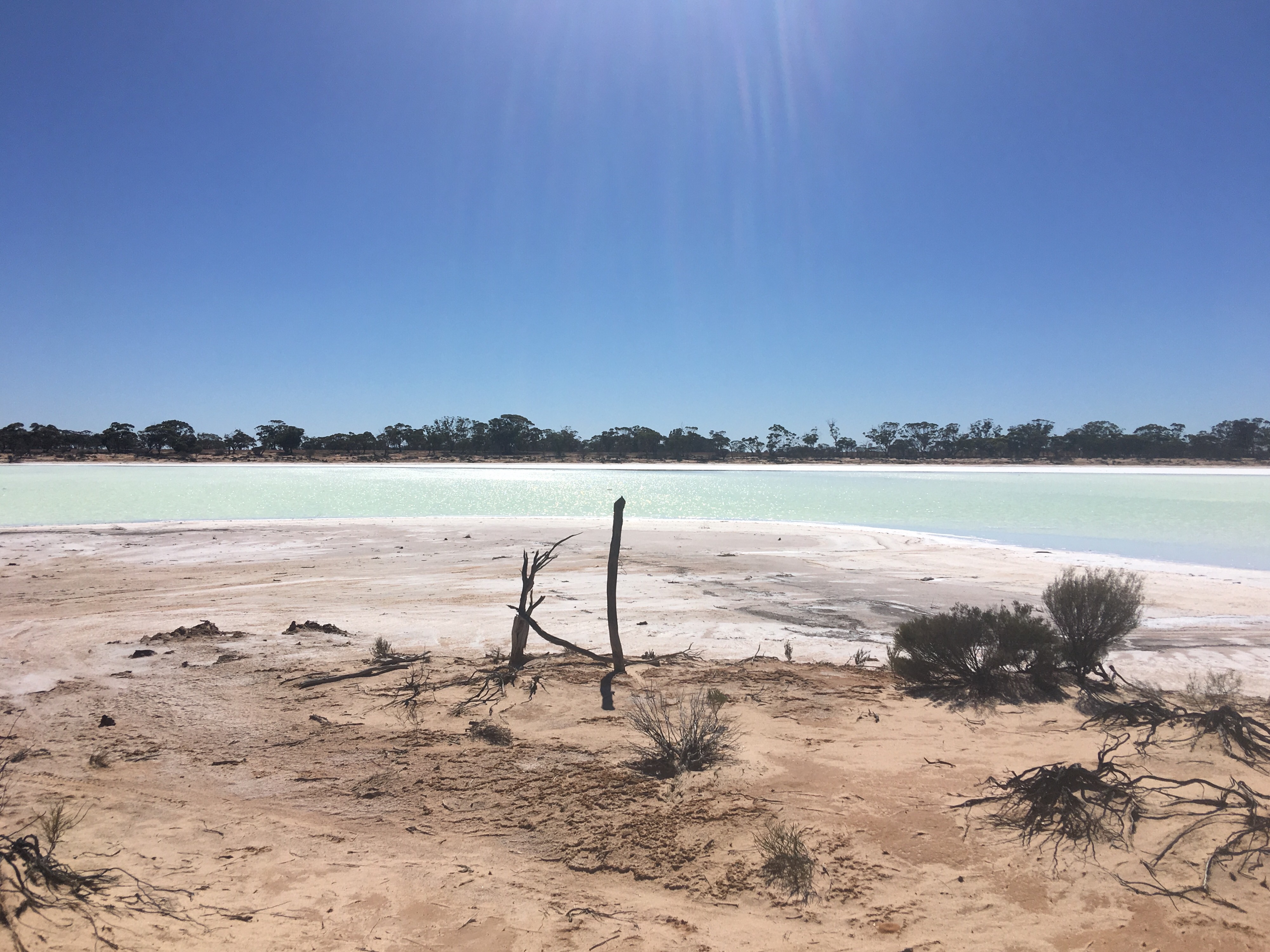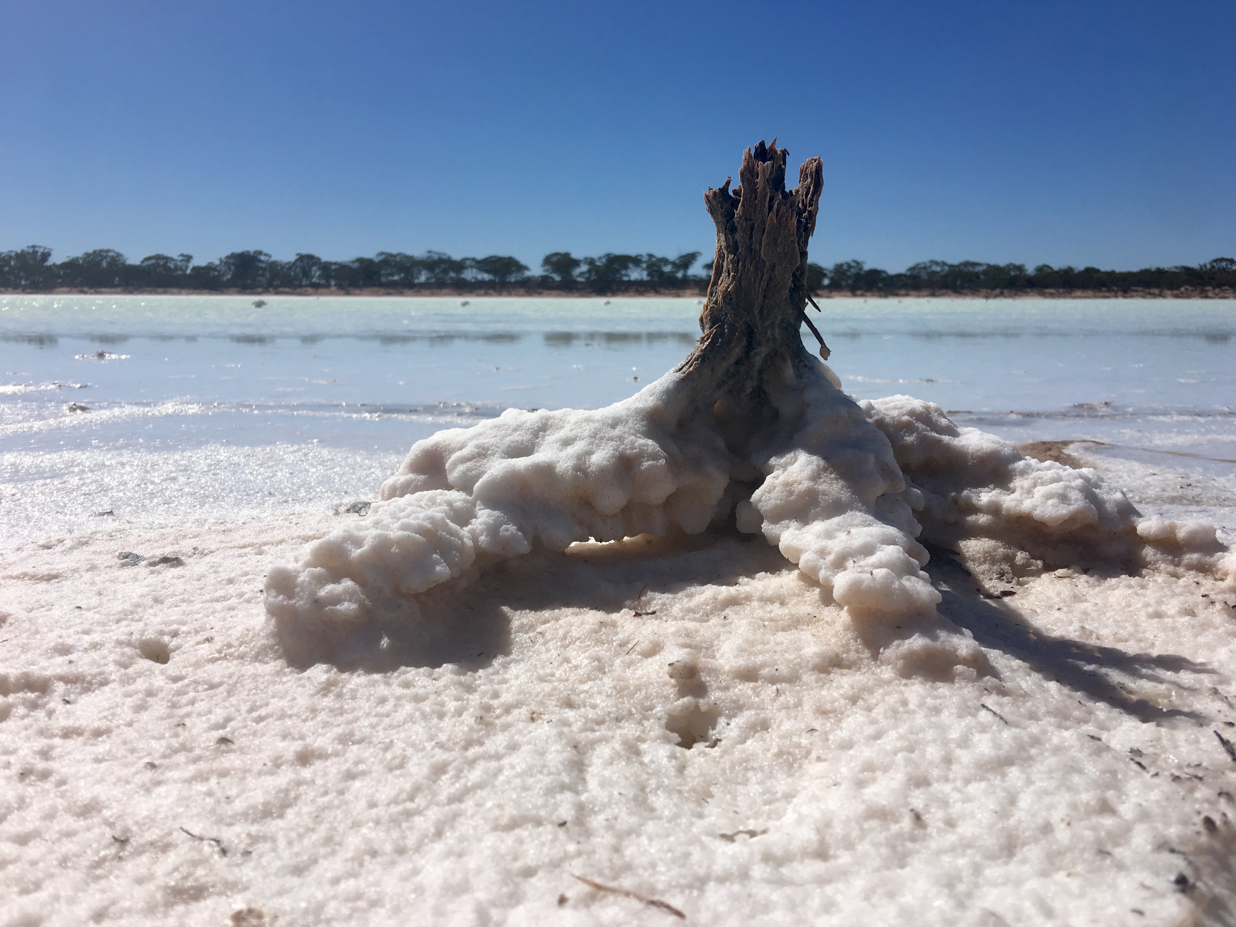 WA recently had a wet summer with heavy rains and floods, particularly in the south. A result of that was the salt lakes in the Wheatbelt filling up with new water. I’ve never seen this particular lake so blue before. The sun made the salt shimmer as it crunched under my shoes. It has crystallised over time and looks almost like ice.